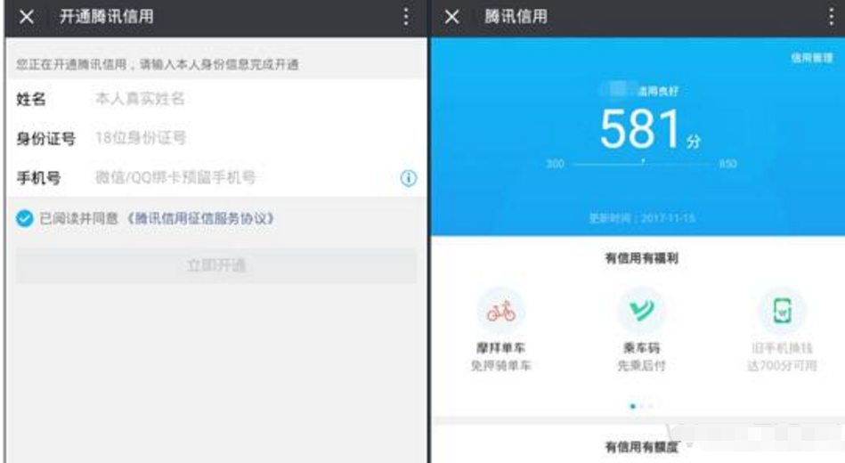 然后左边下角“查信用分”填写自己的信息开通即可